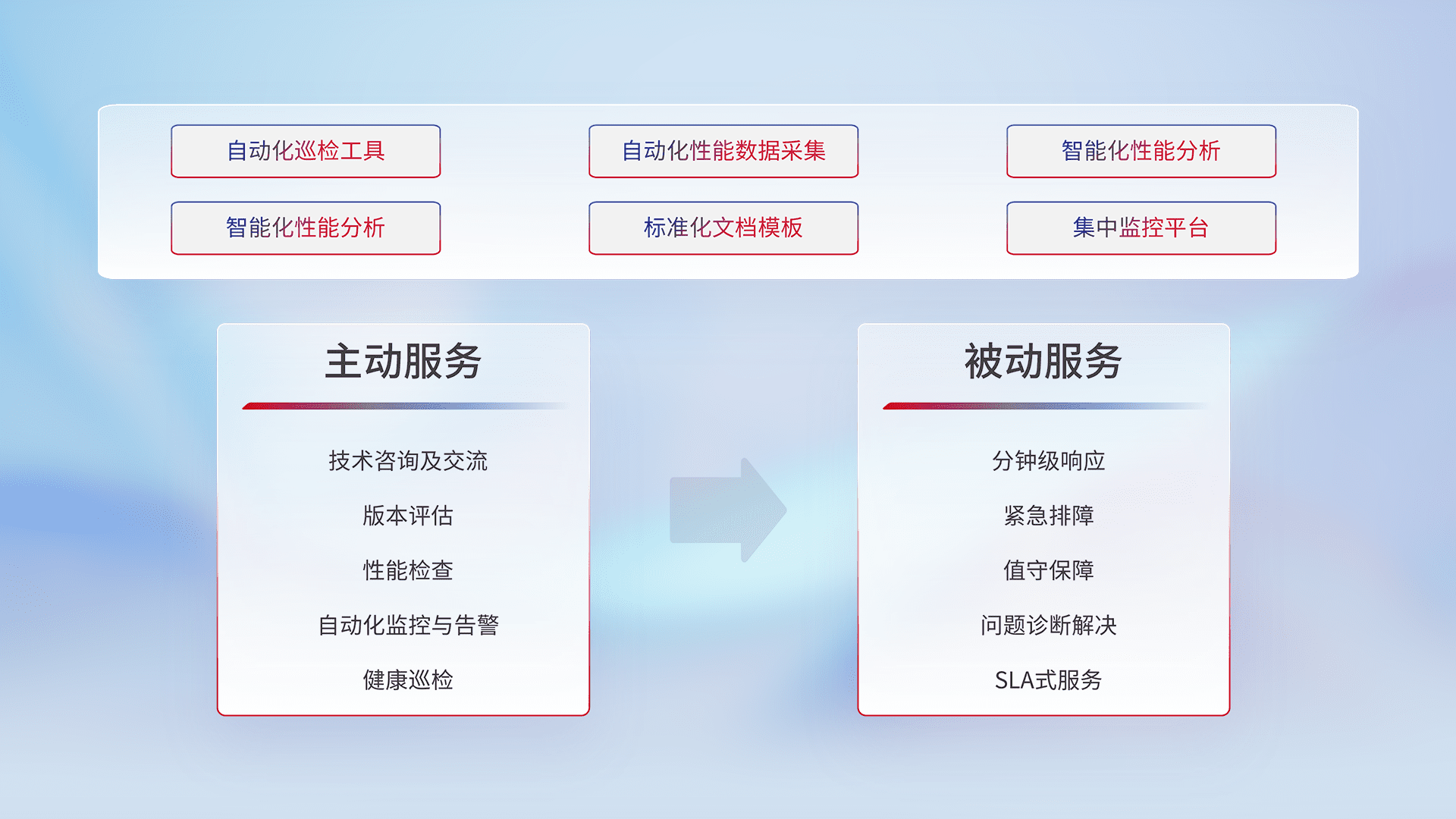 智能化工具和标准化文档,,,保障服务质量,,,提供主动服务(包含技术咨询、、、版本评估、、、、性能检查、、、、自动化监控与告警、、、、健康巡检)和被动服务包含(分钟级响应、、紧急排障、、、值守保障、、、问题诊断解决、、、SLA服务)。。。。